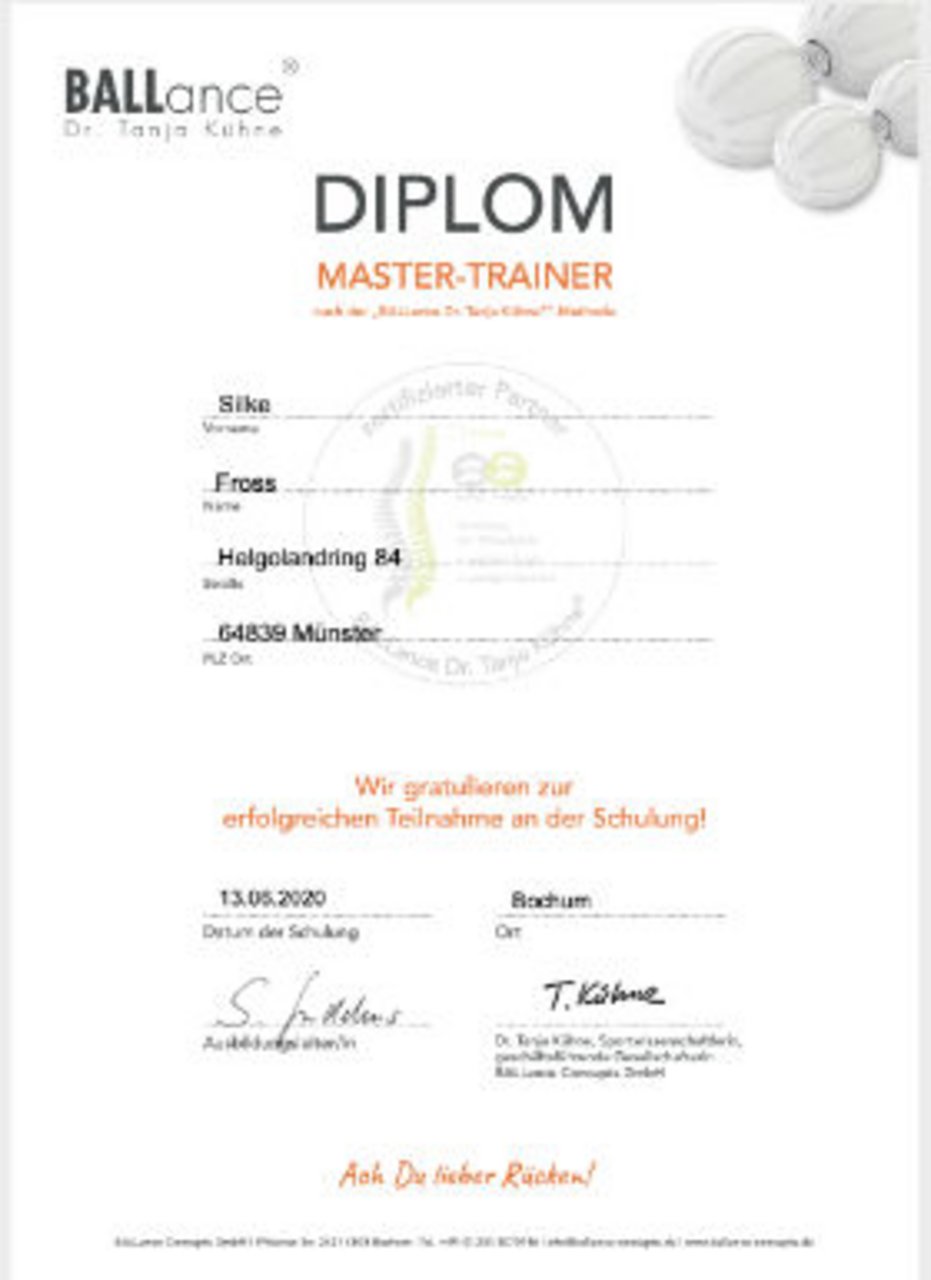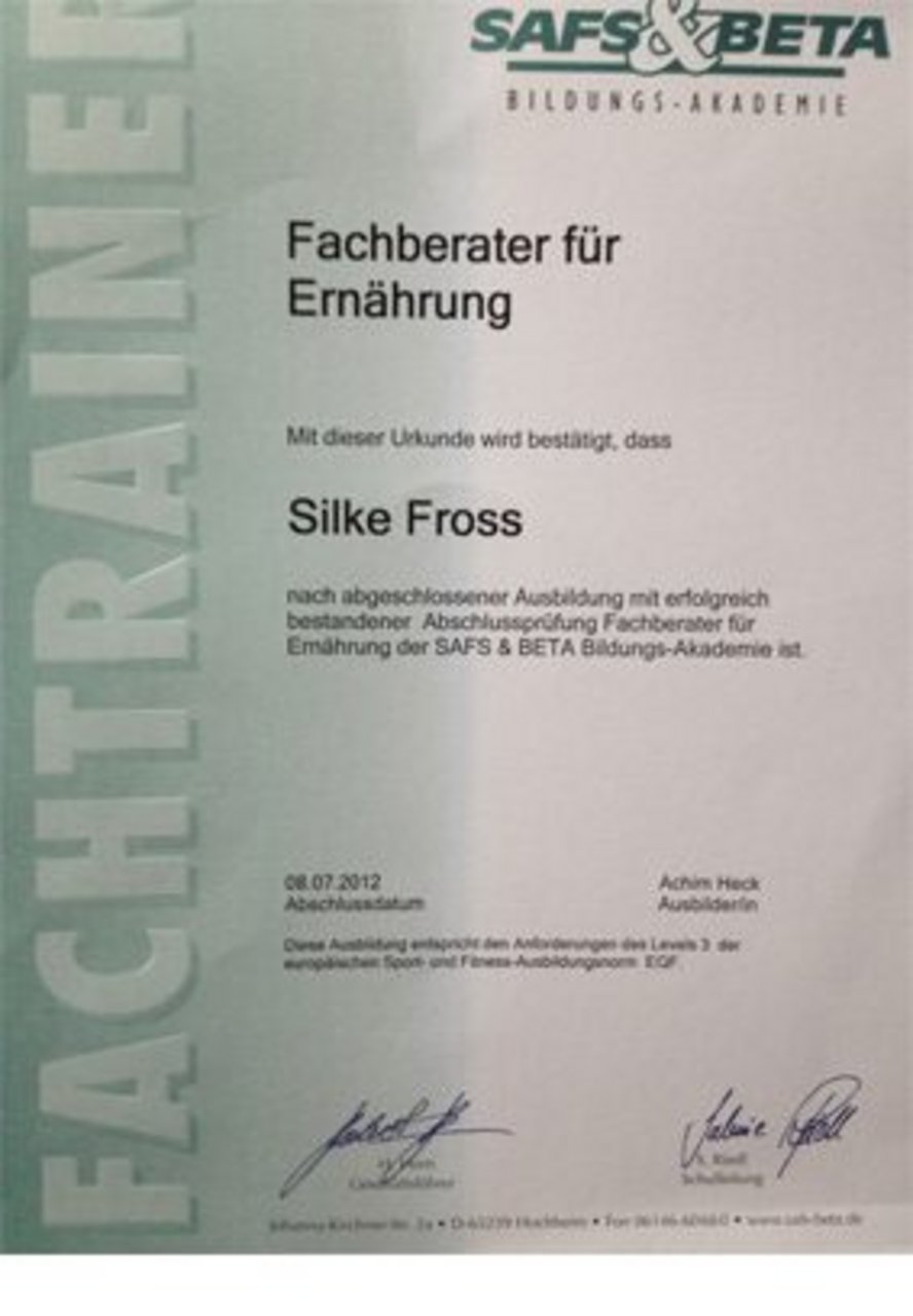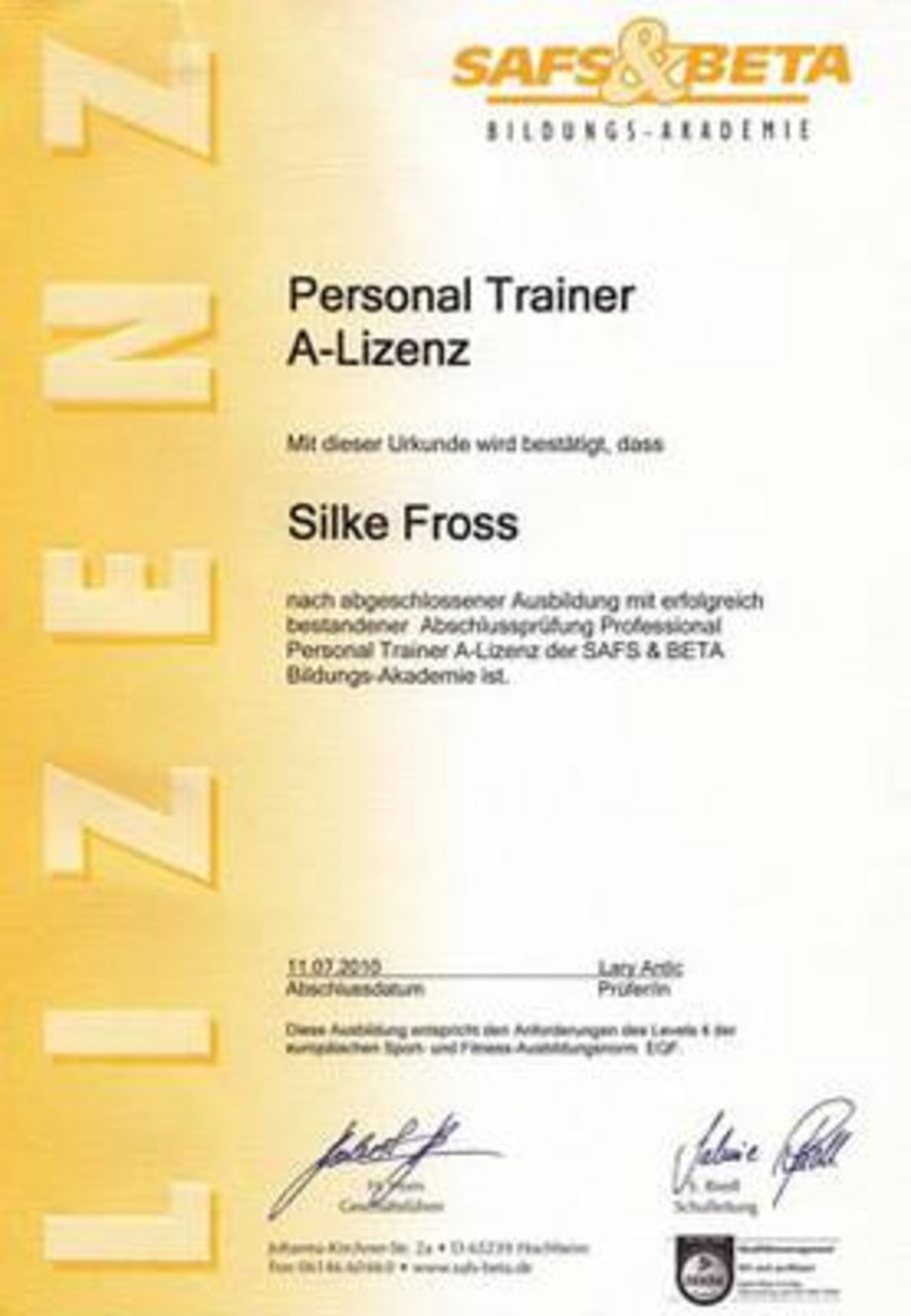 Für Silke Fross folgten auf diese Erkenntnis unter anderem eine Ausbildung zum Fitnesstrainer mit B-Lizenz, Fortbildungen zum Ernährungscoach und Entspannungstrainer und schließlich erhielt Silke Fross die B-Lizenz als Personal Trainer und im Frühjahr/Sommer 2010 die Personal Trainer A-Lizenz.